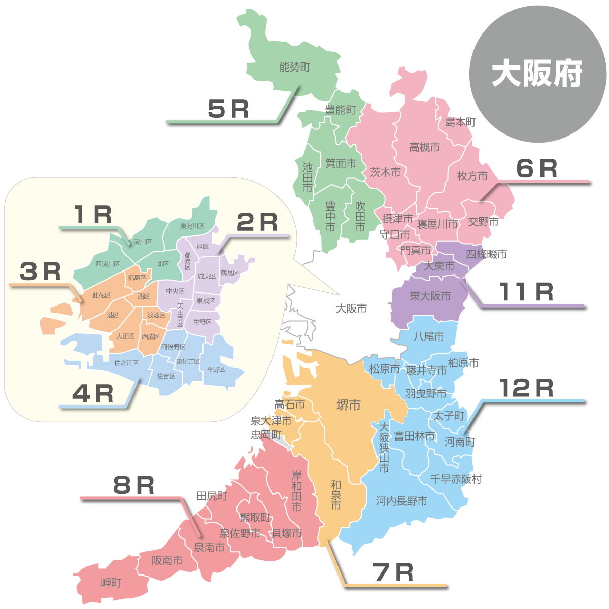 吹田東ライオンズクラブは、地図上の緑色で示されております5R(リジョン)の1Z(ゾーン)という管理地区に分類されます。